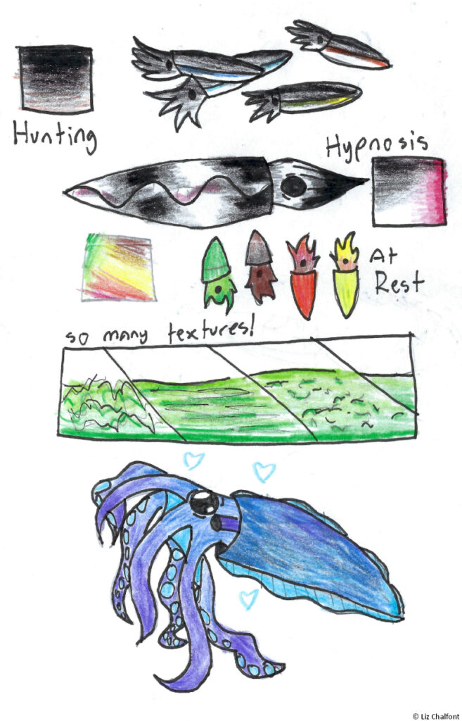 I, much like the others who are still here, have taken to removing myself from the ever-increasing horrors around me by diving into my work as much as possible. I’ve gone back to look at my older research, and I think I can do better now at creating an accurate translation of the void squid color palette. – When hunting, the Void Squids turn black, with whatever angle of their bodies points downward changed to white. The particular shades of these colors change based on time of day, resulting in an almost seamless camouflage. – When using their hypnosis, they flash the darkest black and brightest white they can and synchronize to each others’ flashing. They replace the white with pink and red to communicate a coordinated strike. – While at rest, void squids tend to be somewhere between orange, yellow, green, and brown They often change their texture like octopi, but this doesn’t help much with camouflage in open waters. My current theory is that it is related to communication, but I’ve made little progress in understanding it. – Ina often turns blue and purple in my presence. I have seen wild void squids doing this with each other as well. Judging by when Ina goes blue with me, I believe it signifies affection. The feeling is quite mutual. My time with Ina is making it clearer how social, emotional, and intelligent his species can be. I wonder if this could be related to the squad’s social nature… This is speculation at best. And I know better than to assign human thought and reason to wild animals. But, still… I can’t help thinking that this could explain why the squad is so aggressive toward humans. After all, we are keeping one of them as our prisoner. A somewhat comfortable prisoner, I hope, but imprisoned nonetheless. The last time we did that… the ship was sunk with many casualties. Oh no, my theory seems downright plausible. We’ve made a mistake. The reason the squad is attacking, and why so many of us are dead, can only be that it’s our own fault. They just want Ina back.