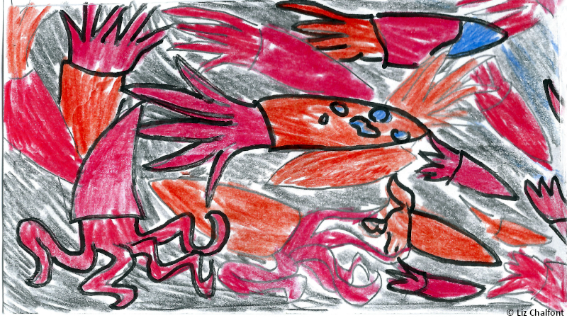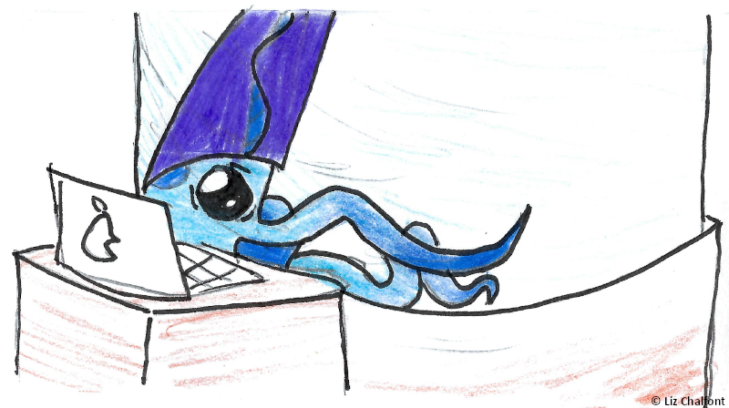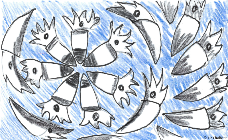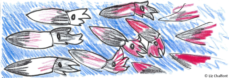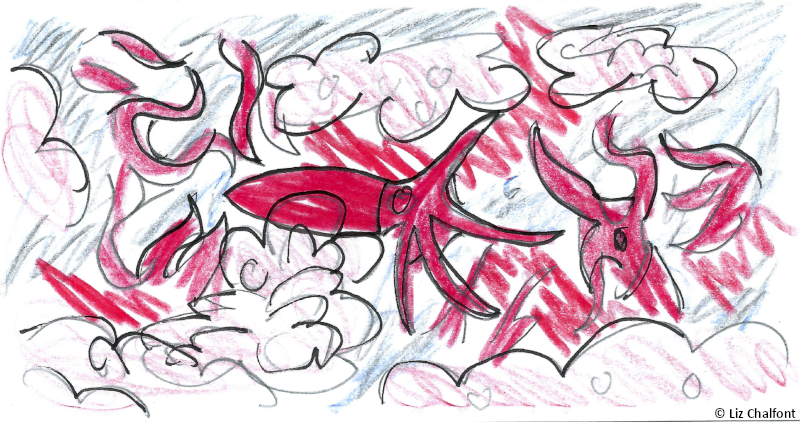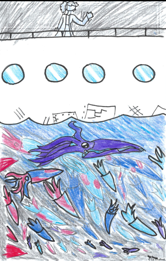 I was nearly taken today. I made the mistake of not checking the cameras when I went abovedecks last night. As I turned toward the water… Squids. So many squids! I’ve seen their sheer numbers surrounding us before, but I was unprepared to see them all, pale and white like death, staring directly at me. Then they began changing colors. I knew, deep down, that this was how they would get me, that I was in grave danger, but something about it– all those animals, hypnotically drawing me closer, white black white black white black white– kept me from running. My fear faded quickly– black white black white black white– who cares what happened to the others? Those animals, floating there, were just so wonderful. Surely they wouldn’t cause any harm. I felt like I was locked in place. Then my legs started bringing me forward– black white black white black pink– they looked like one giant eye, drawing me inexorably closer and closer. I would’ve followed that eye anywhere. Just thinking about it now is enough to make me shiver. I started to step over the railing, fully prepared to let myself fall just to be closer to the great eye in the water– black pink black pink red black red RED black RED RED RED– oh, it was so painfully beautiful– when something pulled me back, away. I was still half-dazed from the hypnosis when the squids surged onto the boat’s deck. Meter-long arms covered in talons that could easily rend my flesh apart unfurled faster than whips. Finally I came back to myself and ran. My savior was Erin, one of our galley staff. She had just happened to see me on the ship’s edge and disregarded her self-preservation instincts to help me. I remain rattled from the experience, but I am also incredibly grateful to her. Erin is sitting beside me now in the lab. Ina is excellent company, but he is at the end of the day a cephalopod and unfortunately cannot speak or understand English. Amidst this chaos and fear, it’s nice to have a human friend on this ship.
