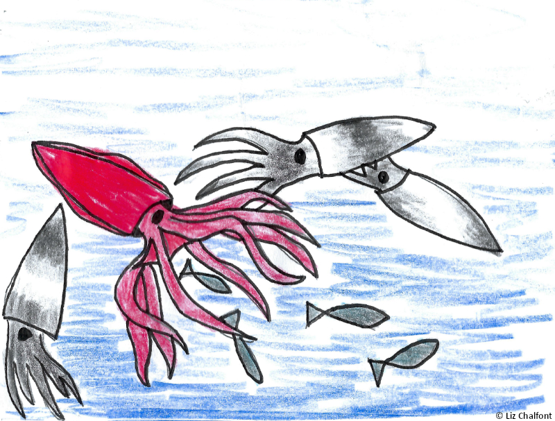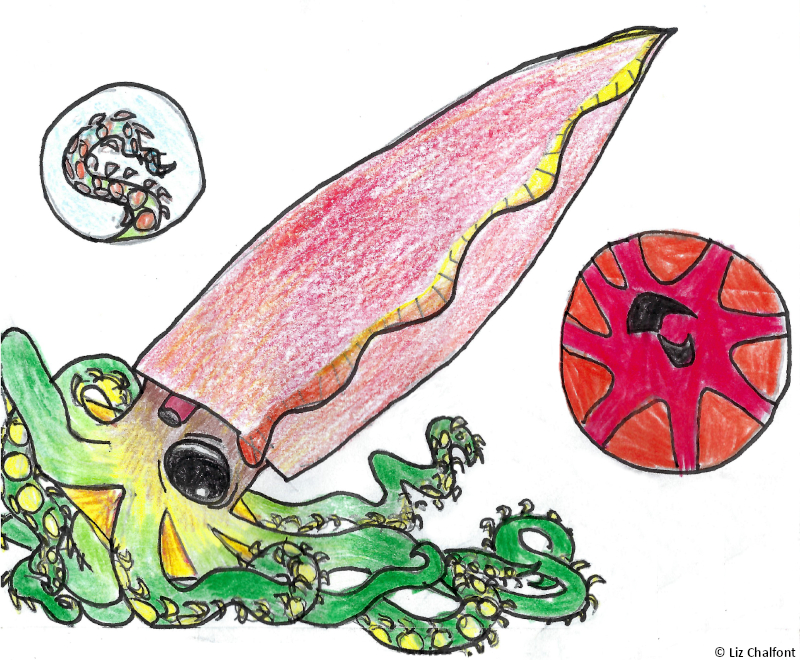 It’s nearly midnight. I am in the lab with Erin and Ina. We began this expedition with 47 people onboard. 16 are left. Outside, the rest of the squad is attacking our ship. They are all bloodred. Between their claws, numbers, intelligence, and sheer strength, I doubt we can hold them off. I was out above decks earlier on my way to the lab and saw that some other researchers managed to shoot a few void squids, but there are hundreds more mobbing our vessel, ready to take their place. I was awoken earlier by a spray of water to the face as one of the metal panels on the side of our ship was torn away by raging cephalopod fury. Our captain refuses to do anything, so I have no choice. I must take this situation into my own hands, and by situation, I mean a squid. I am certain that the squad is only attacking because we have taken one of their own. Ina would not do me any harm. I have discussed my theories with Erin who agrees. We know what we must do. Right now, I am carrying Ina out of his tank to the upper deck. He is clinging onto me for dear life. It is not an ideal situation, but I can’t really do better at this moment. His arms are all blue, and were I one of his species, I would be the same. I will miss Ina greatly, but there is no other way to prevent more pain and death. Ina and I embrace one last time, and I release him back into the ocean.