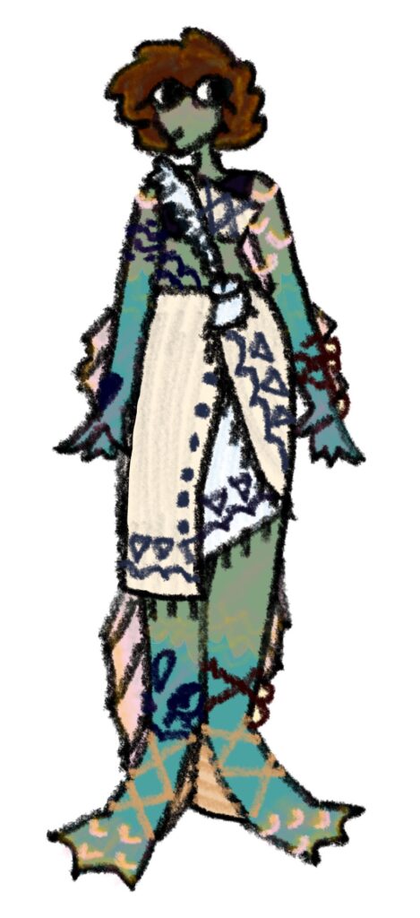 She’s based on a frog because she’s a member of my mer-amphibian species. This isn’t her regular outfit. She prefers to just swim around in the marshes hunting with her friends, but in this case she’s dressed up nice. I think she was supposed to be a princess or something??????