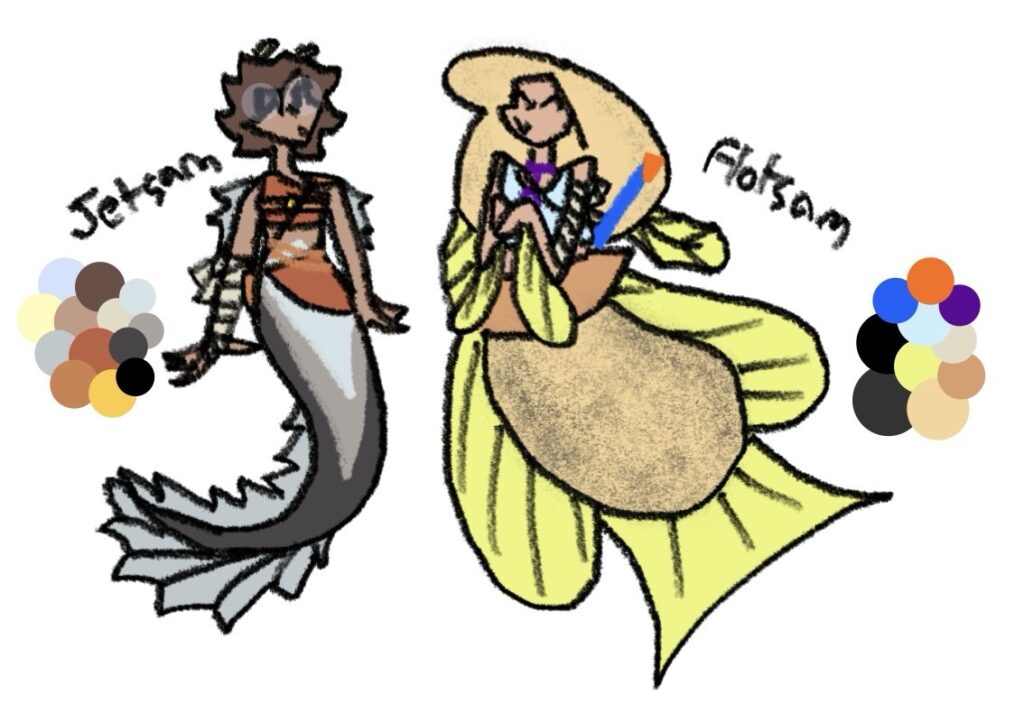 (Jetsam is based on an eel/anglerfish, and flotsam is a flatfish. They have a Dipper and Mabel Pines dynamic. Also, I’ve been asked this before so just to clarify: Jetsam is a boy.)