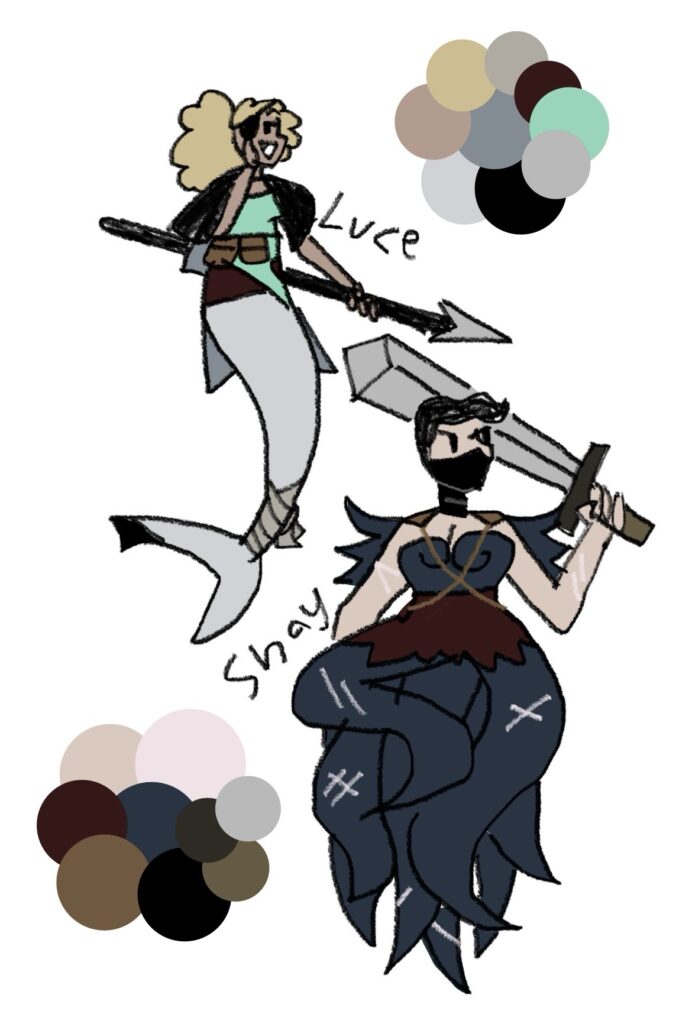 They’re bounty hunters. Luce is a blacktip reef shark with dolphin influences and Shay is a generic cephalopod.