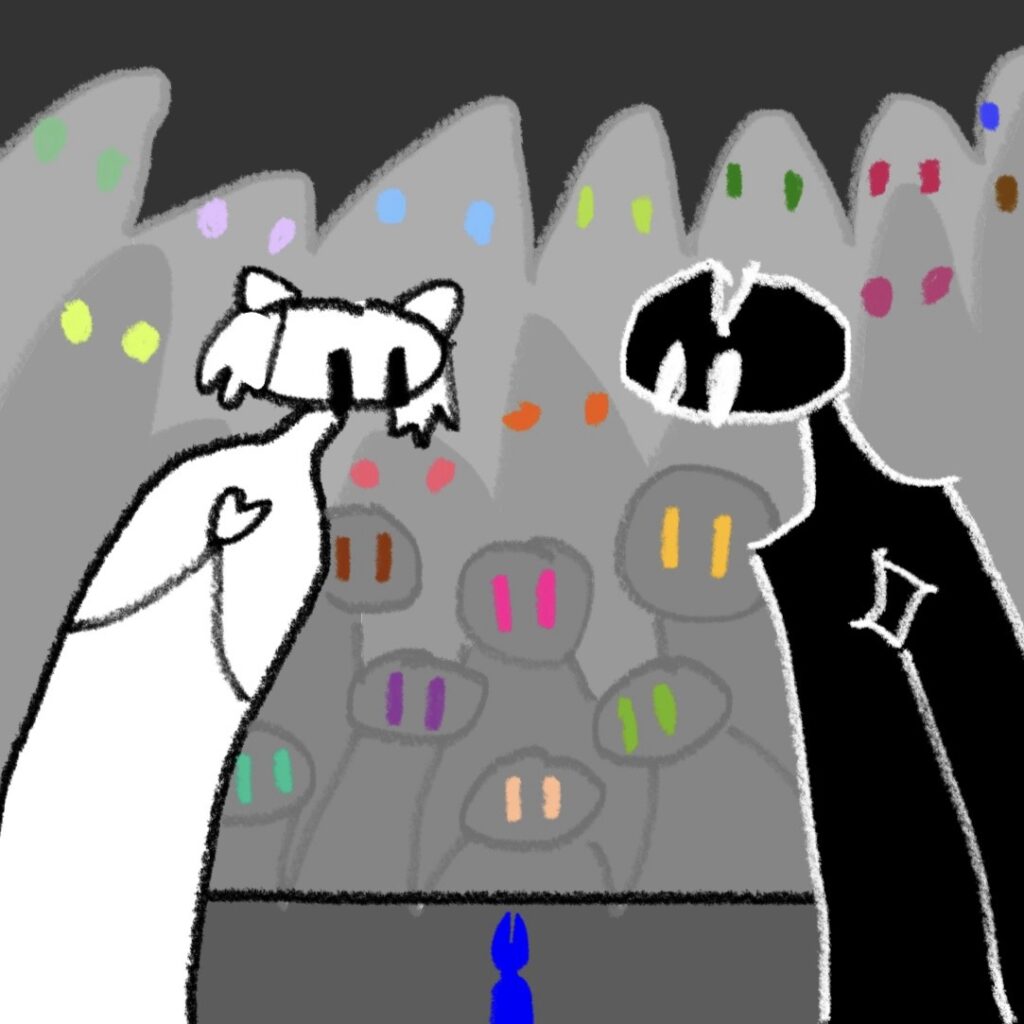 It’s good to be back on dry land. It’s been about a month since Ina returned to his squad. My institute now knows what’s truly happened on these research expeditions and has decided we must leave the void squids alone. Learning about the world around us is very important, but not as important as the well being of us researchers and our subjects. Oh. I still need to recount what happened at the end of my voyage. The raging squad had pulled off a lot of the ship’s exterior plating and were doing their very best to get onboard by way of the deck and windows, with great success due to their squishiness. As soon as Ina hit the water, the raging squad stilled. Then, the vibrantly red squids around Ina began to change to blue. It was beautiful. Blue slowly spread throughout the squad. They detached from the boat and began to disperse. I watched them return to the deep waters. I swear I could recognize Ina departing and that I saw him look back at me. I waved. I believe he waved back. The ship sustained heavy damage and would have sunk if not attended to, so we made our way to the nearest port immediately. I salvaged my notes and was one of only two people who saw the squids leave. I am now considered to be the world’s leading void squid expert with the only accurate account of the Kraken disaster. I am honored by this recognition. Today, I’m meant to give a talk about my experiences to marine biologists I have admired my entire life. I hope some good can come from the loss of so many lives, and I will ensure that nothing like this ever happens again. We must treat research subjects with great care and respect. I have sucker-shaped scars on my hands from when Ina held onto me just before I released him. I hope that wherever he is now, he still thinks about me too. For now though, the void squids will keep their secrets.